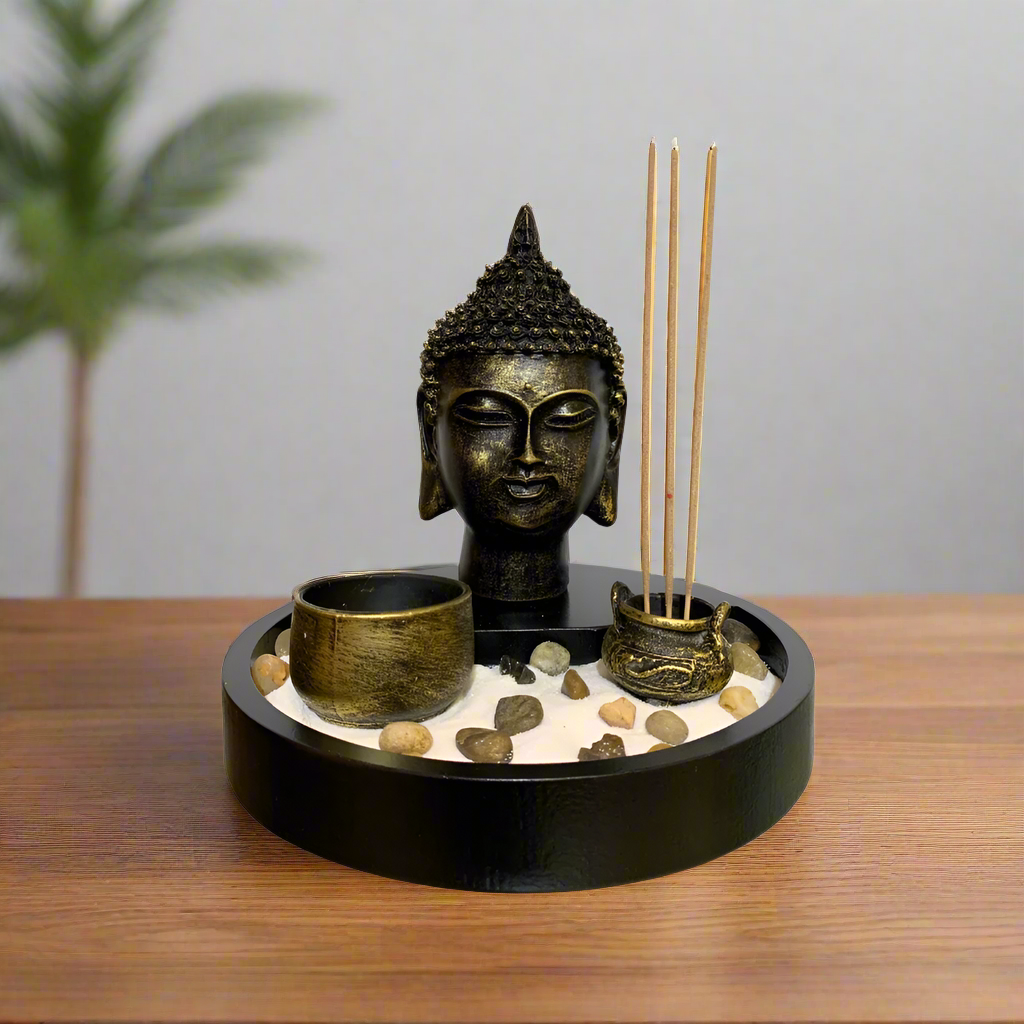 Cabeza Buda Incienso – Armonía que se respira Transforma tu hogar en un santuario de calma con este elegante adorno de incienso Cabeza Buda. Su diseño sereno, acompañado de arena blanca, piedras decorativas y una mini fuente para incienso, crea una atmósfera perfecta para la meditación, el descanso o simplemente para reconectar contigo mismo.