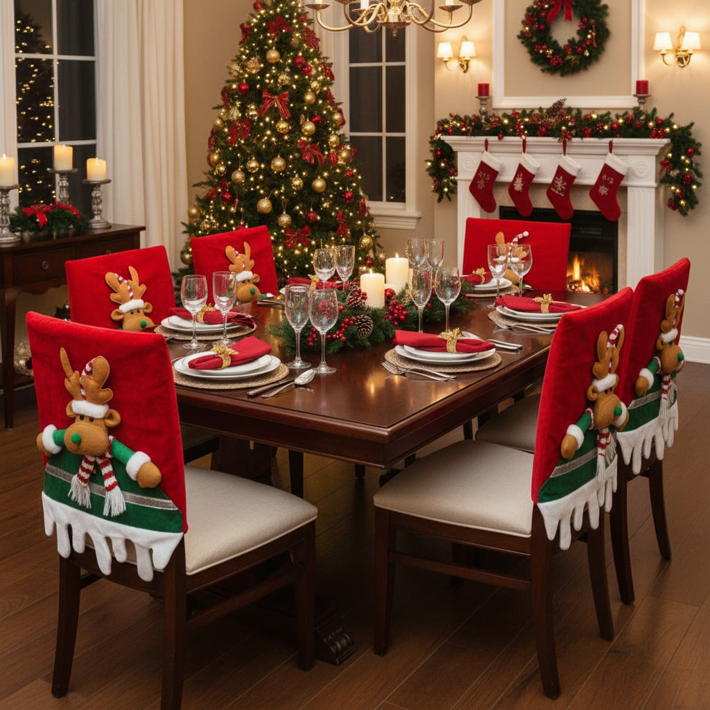 🪑✨ Fundas de Sillas Navideñas 44x49 cm – Reno Rojo y Santa Claus Verde Oscuro
